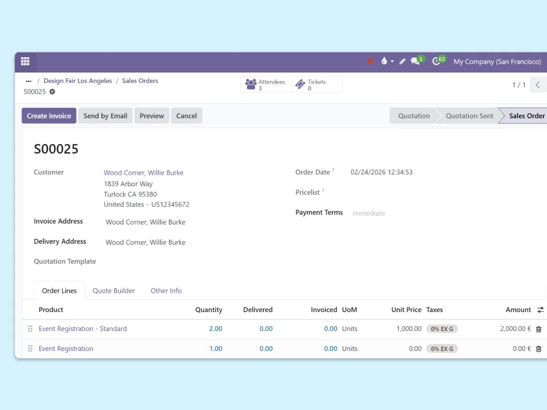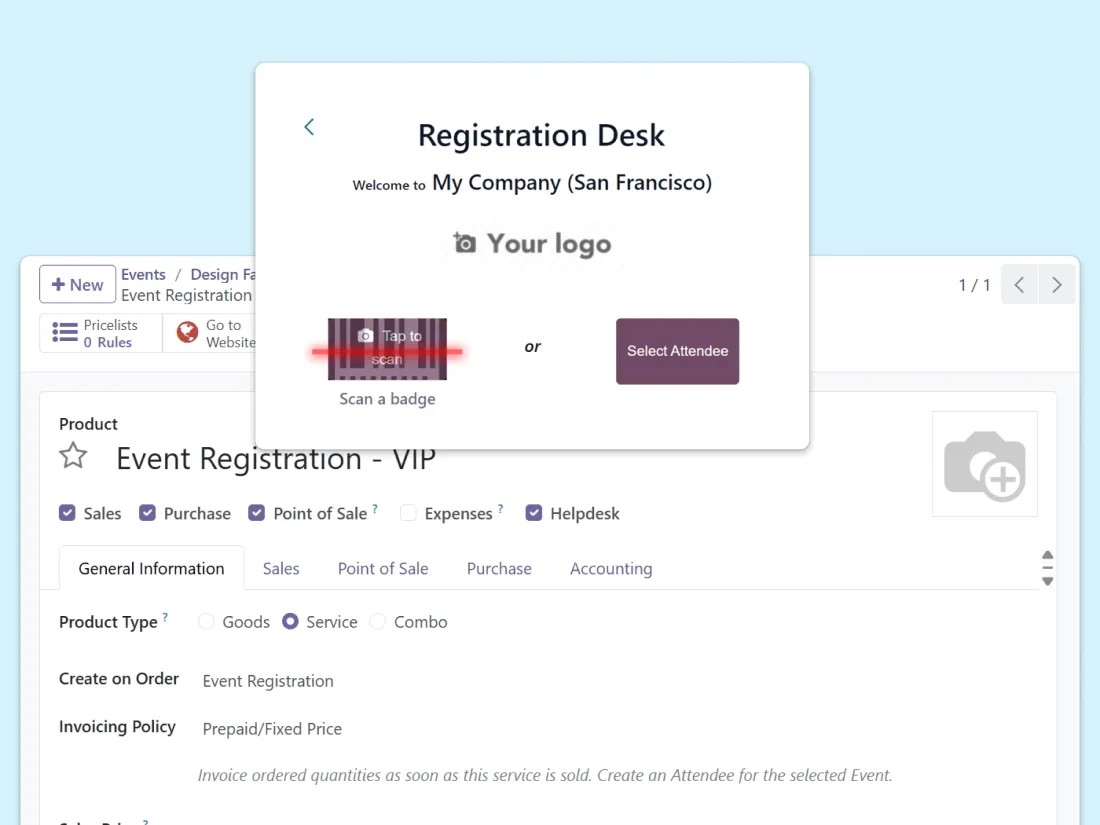 Events works alongside sales, point of sale, inventory, and expenses — all from the same ERP.