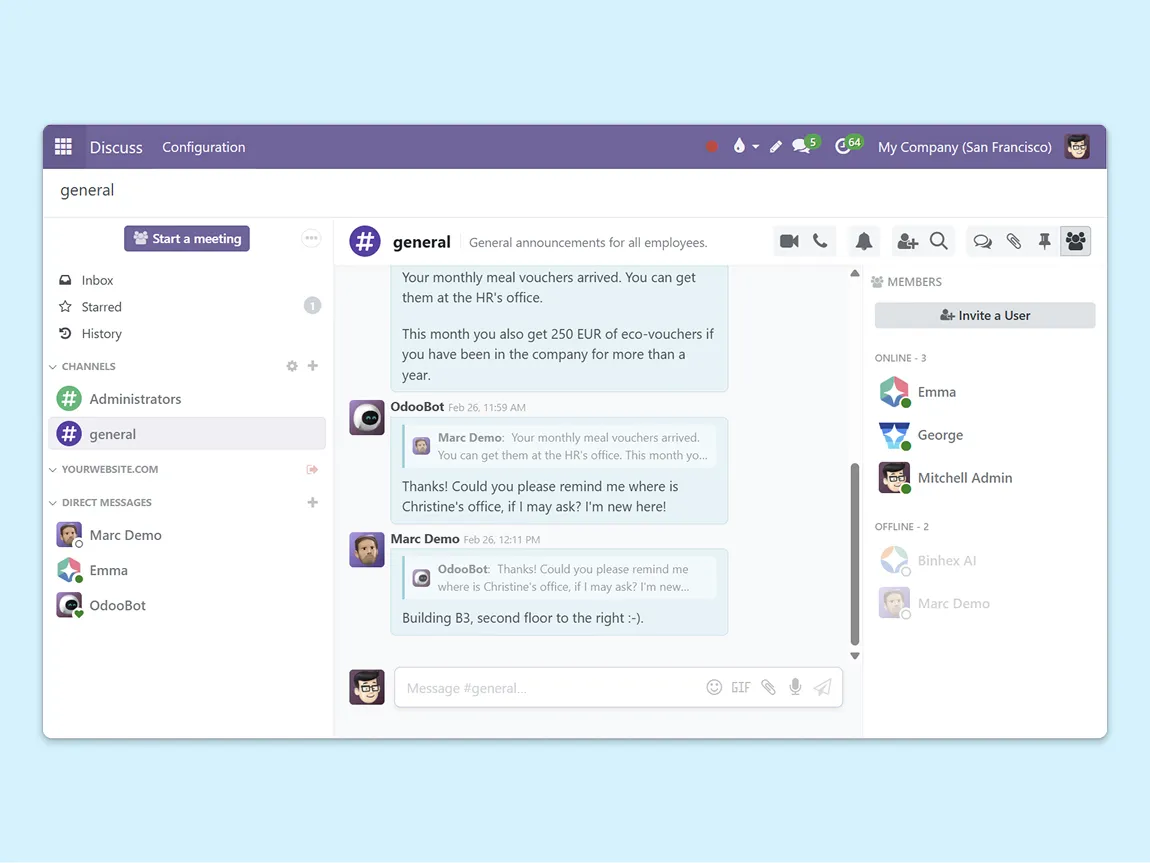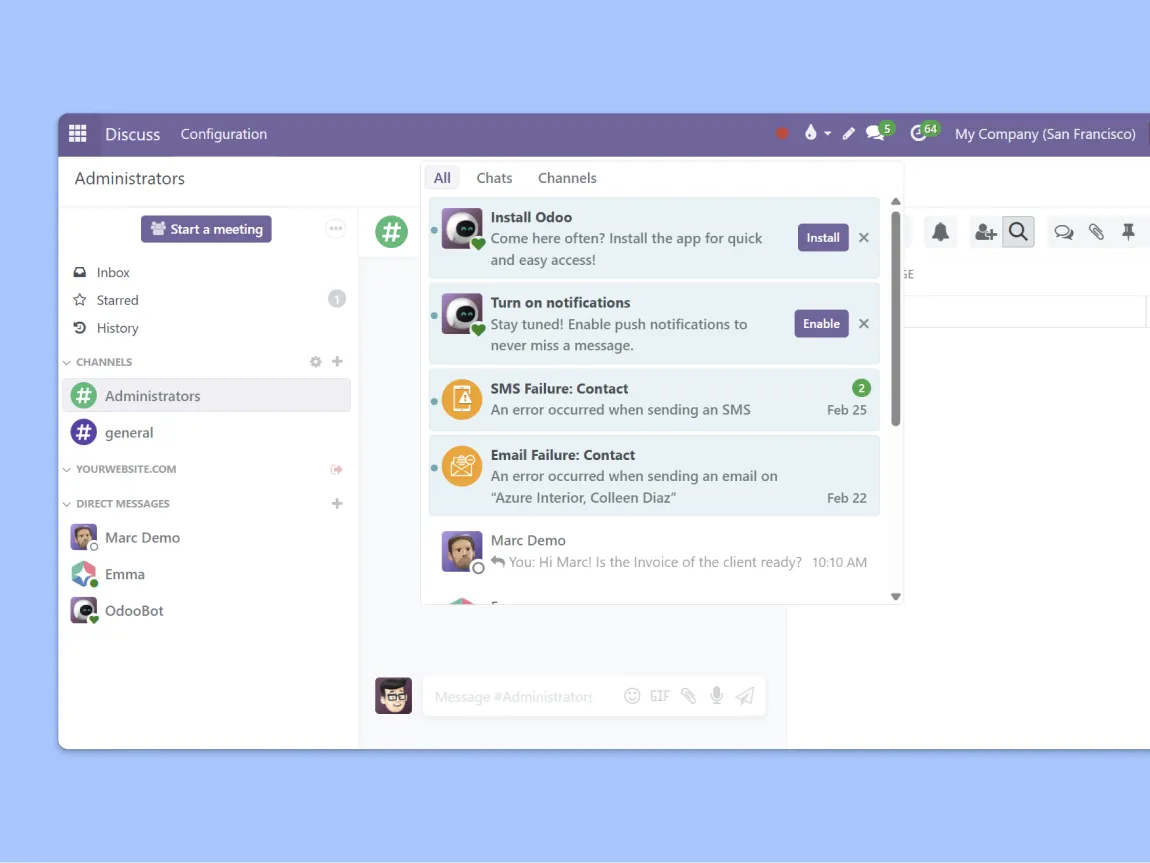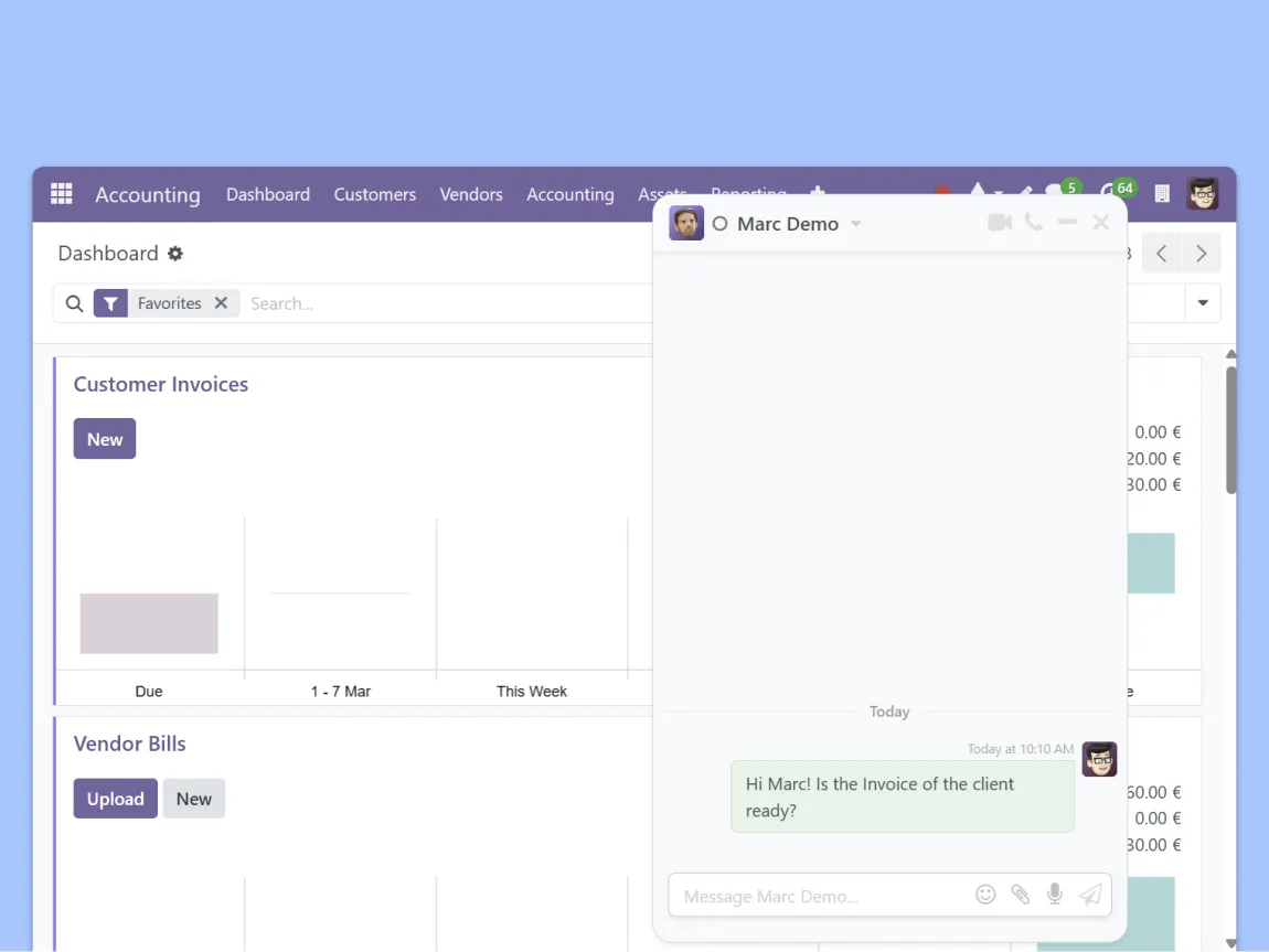 Send messages to colleagues while working on a sales order, a manufacturing task, or a helpdesk ticket. Conversations happen in context — no need to switch between tools or lose track of what was discussed.