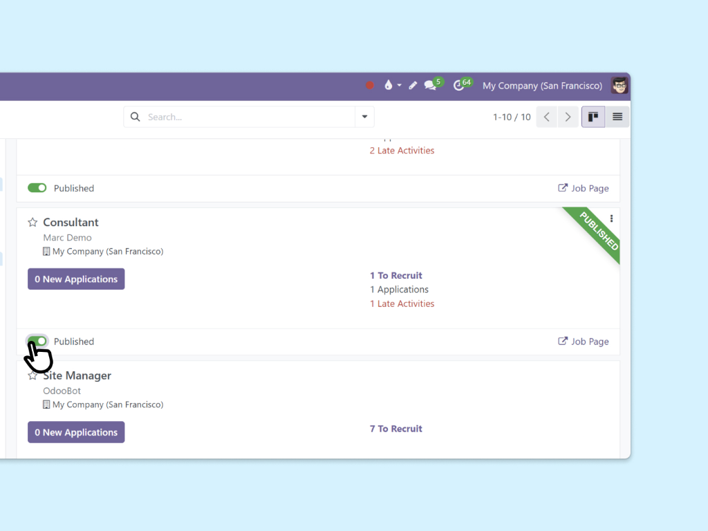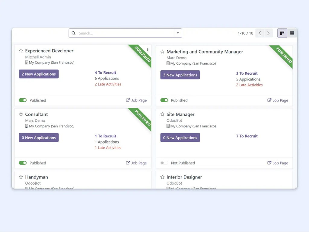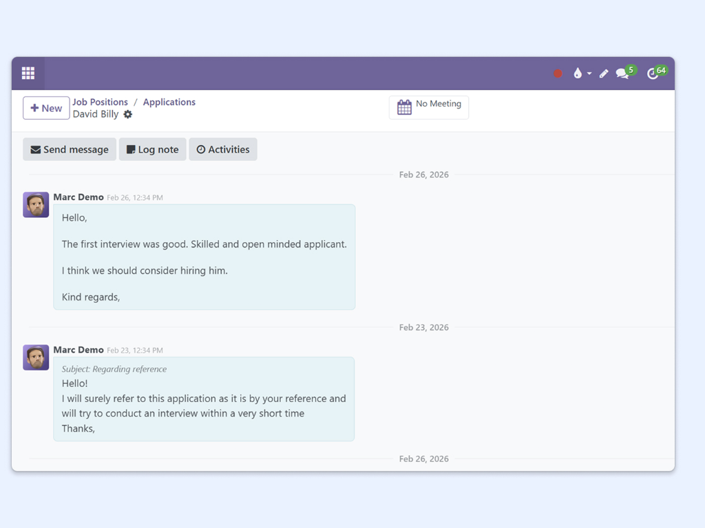 No. One click converts the candidate into an employee. All data transfers automatically to the Employees app, onboarding activates, and they're synced with the rest of the ERP — no manual work required.