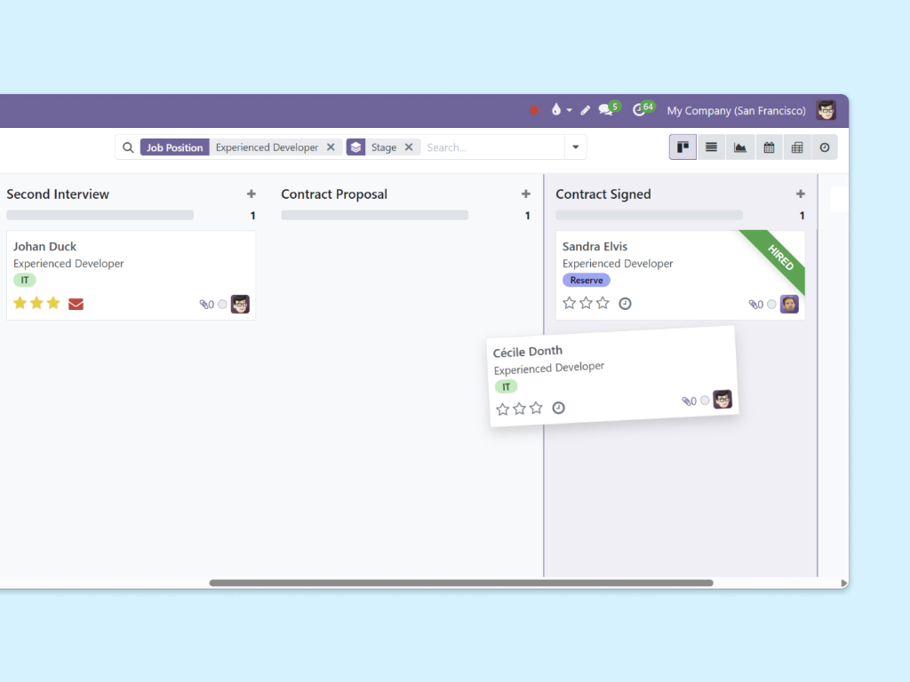 Onboarding launches automatically when the offer is accepted. The new employee is synced with HR, payroll, and the rest of the ERP from day one.