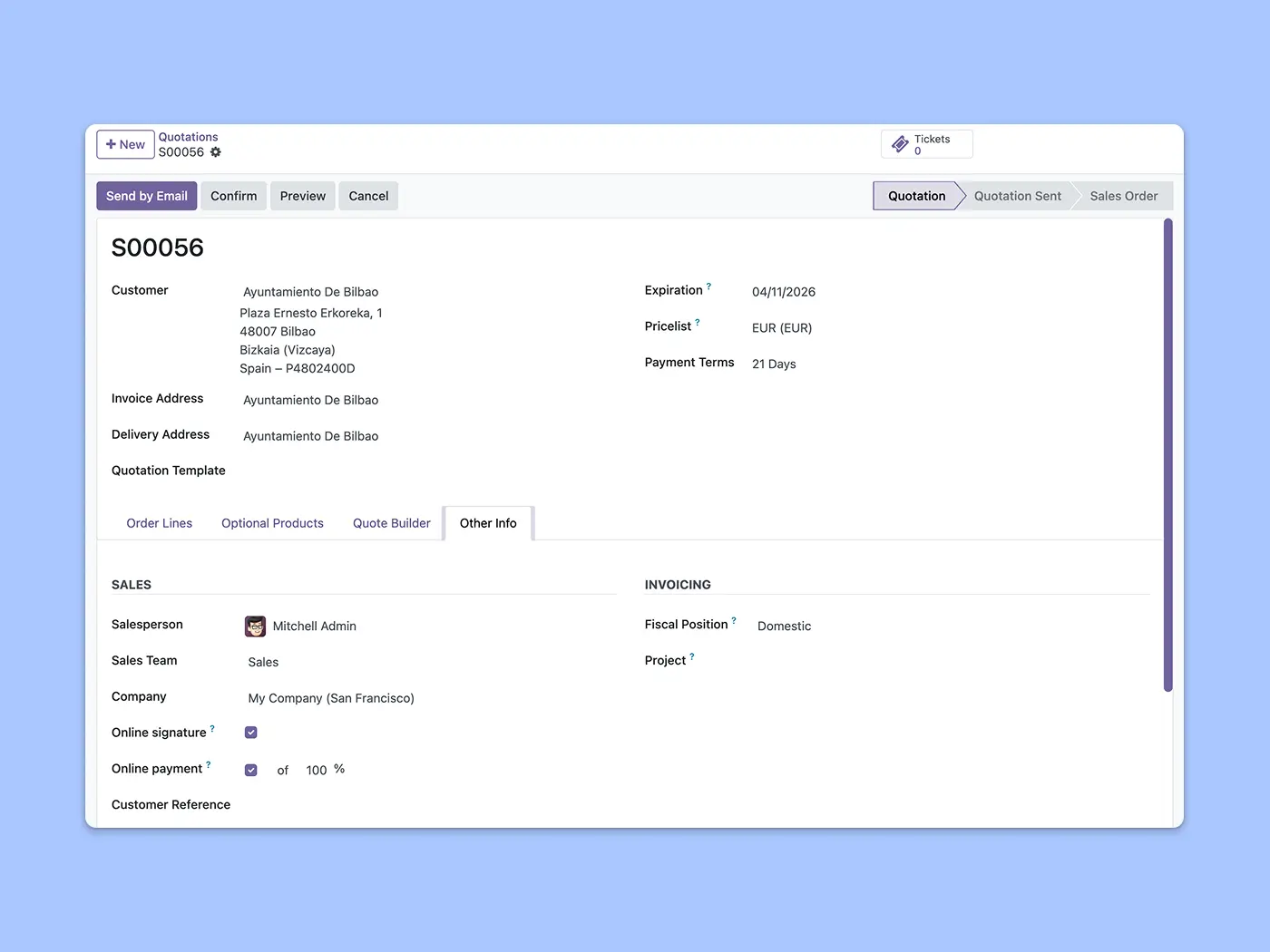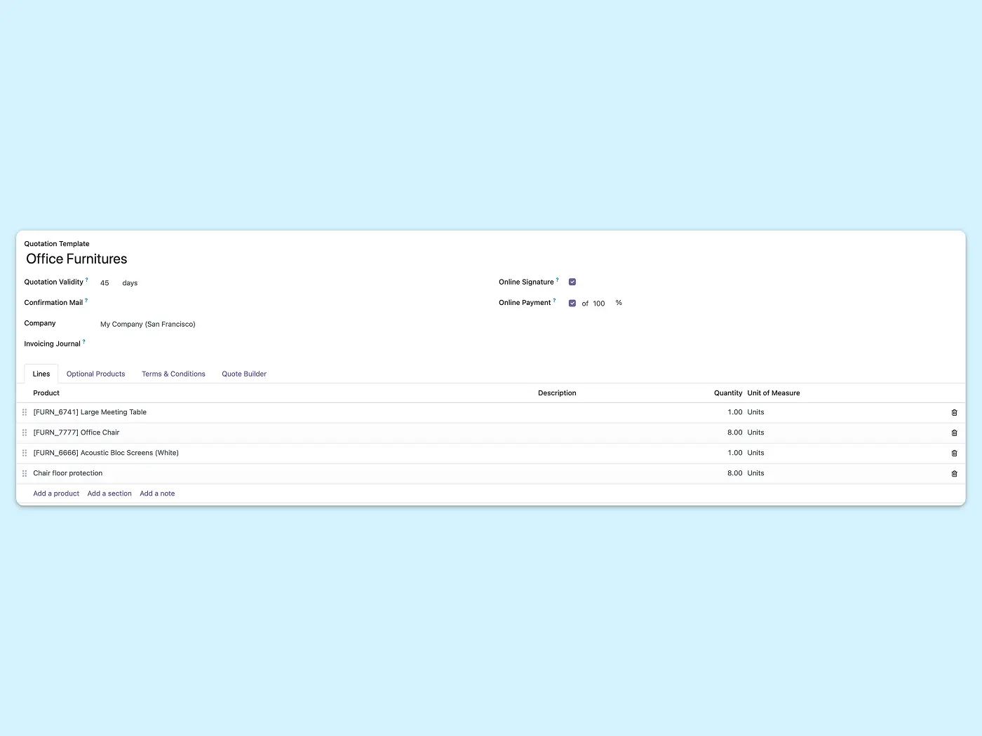 Build quotations from reusable templates, customize terms and pricing, and send them for instant online approval. Customers sign electronically, reducing back-and-forth and speeding up the sales cycle.