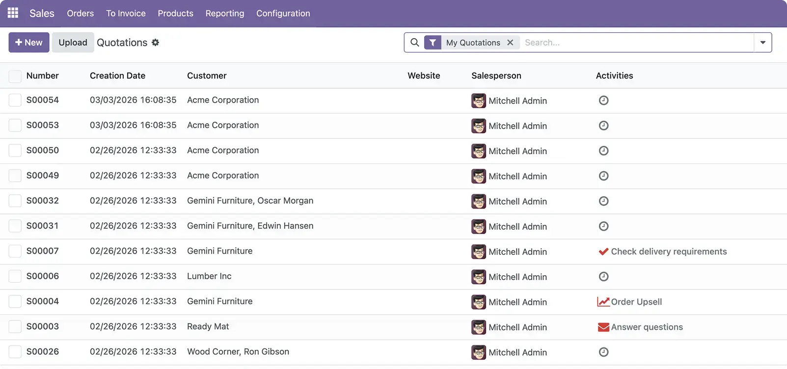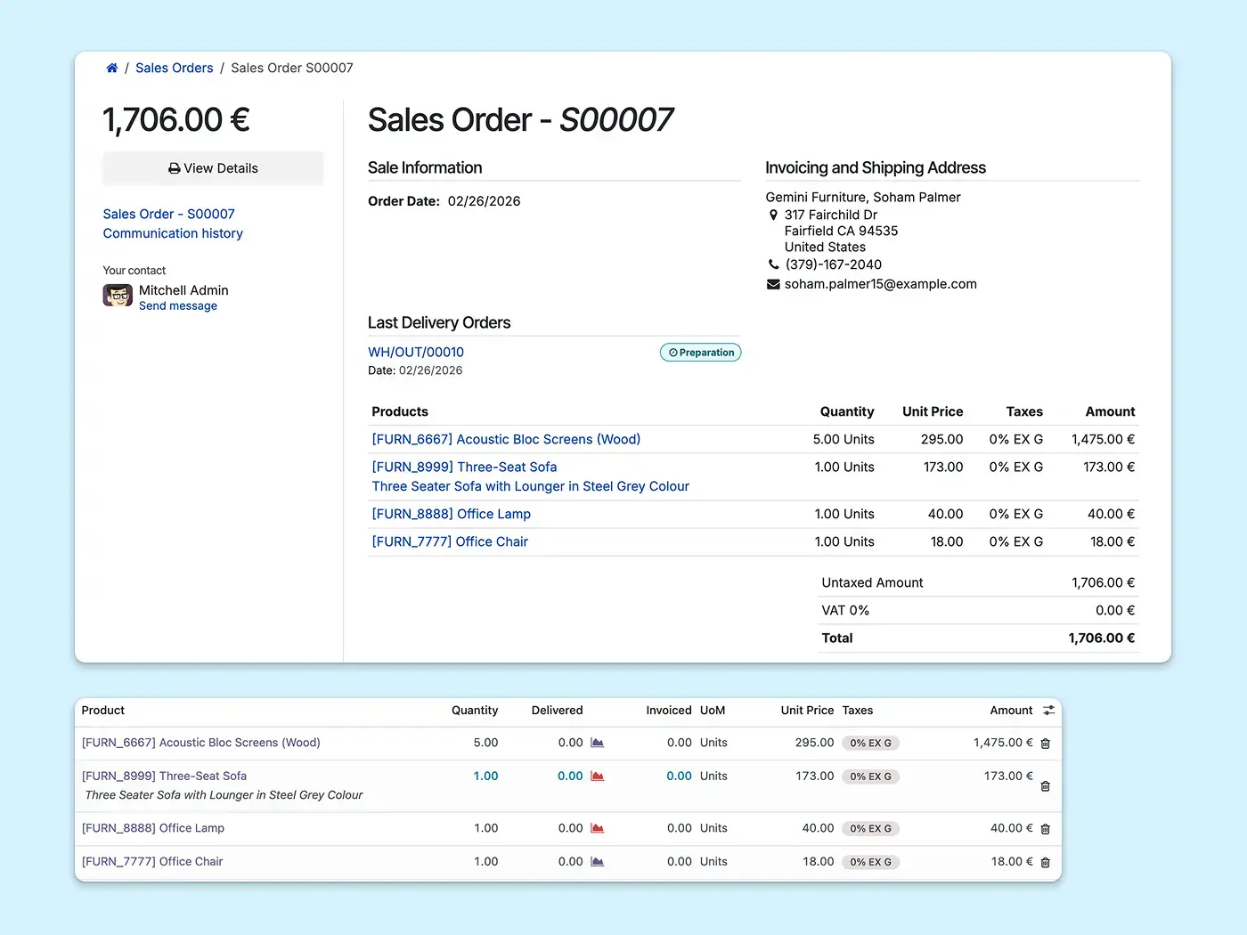 Create quotations, convert to orders, trigger deliveries, and generate invoices — all connected without switching between tools.