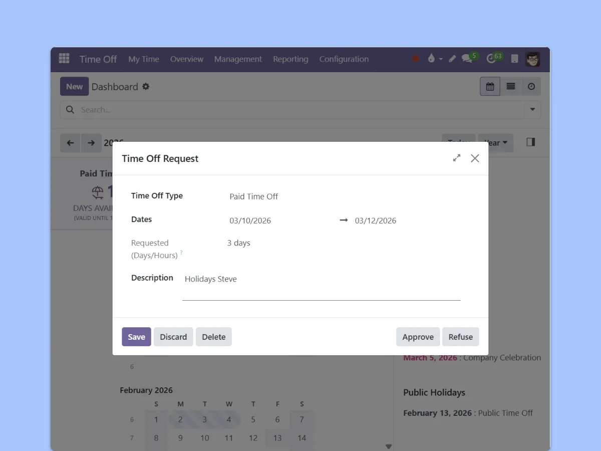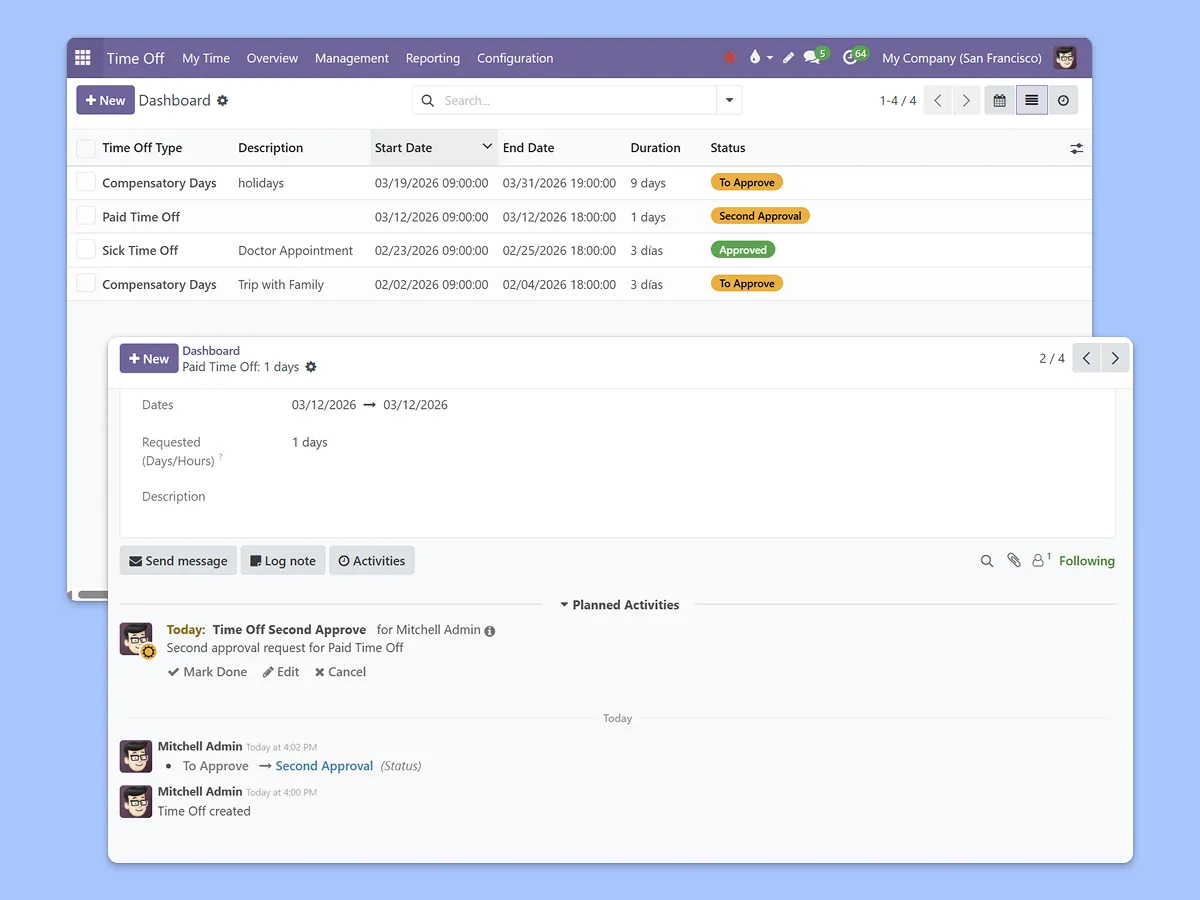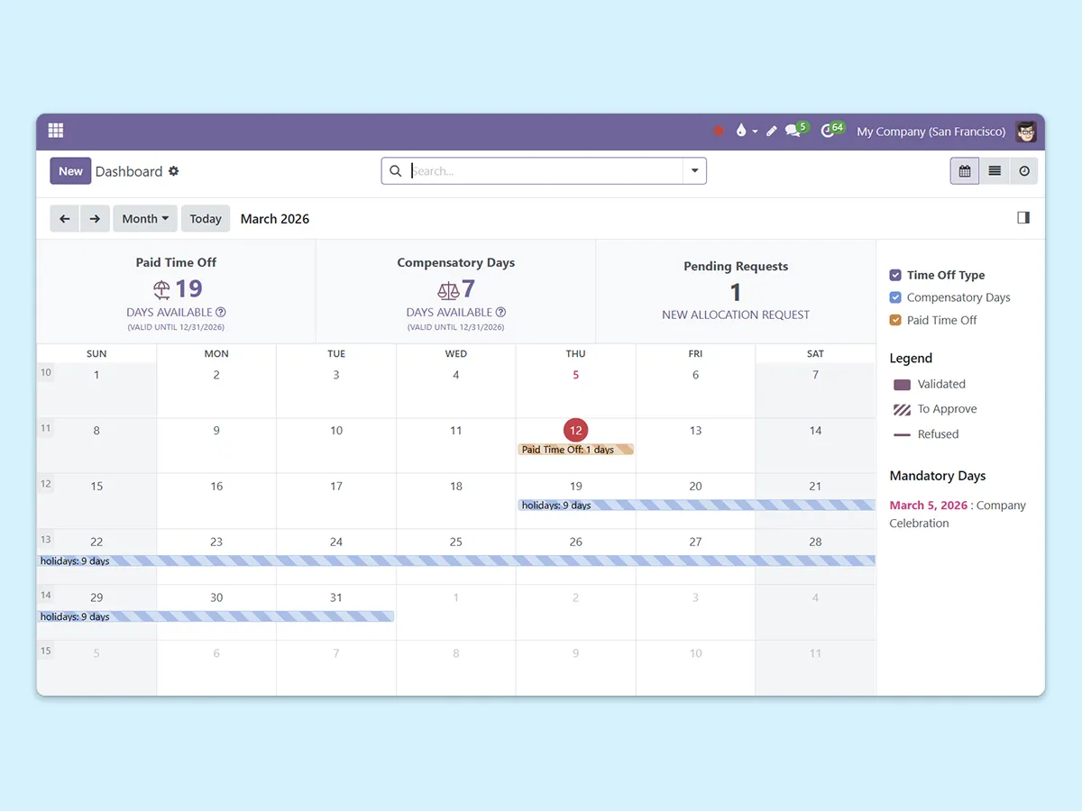 Time off management built on an open source ERP, backed by experts