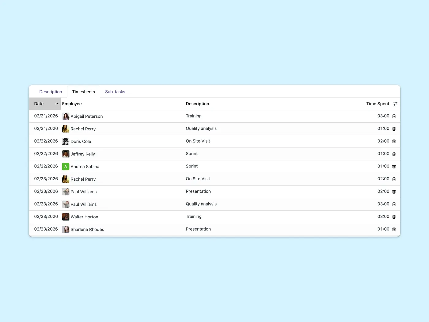 Employees record time directly on project tasks, keeping data accurate and always linked to real work.