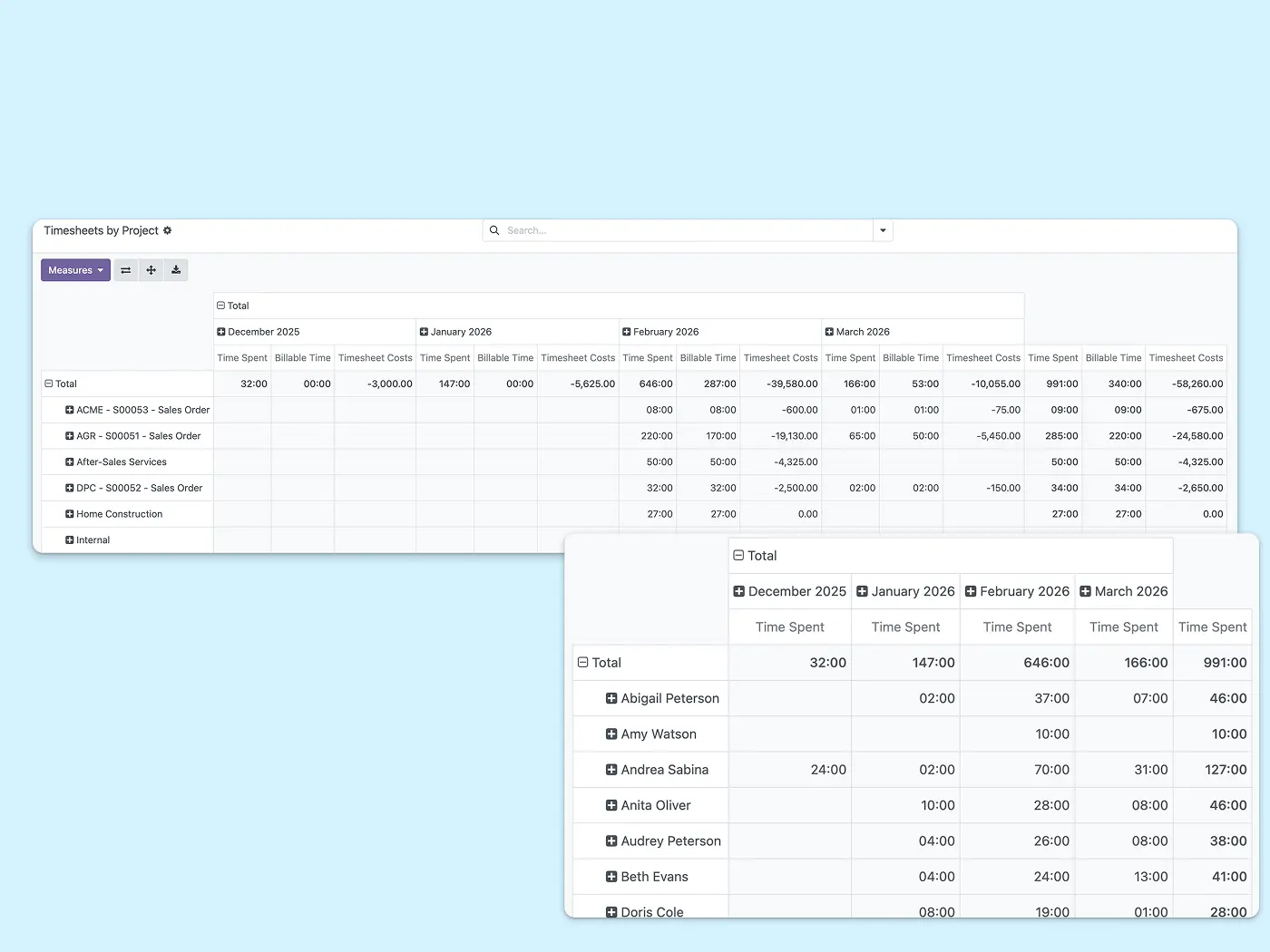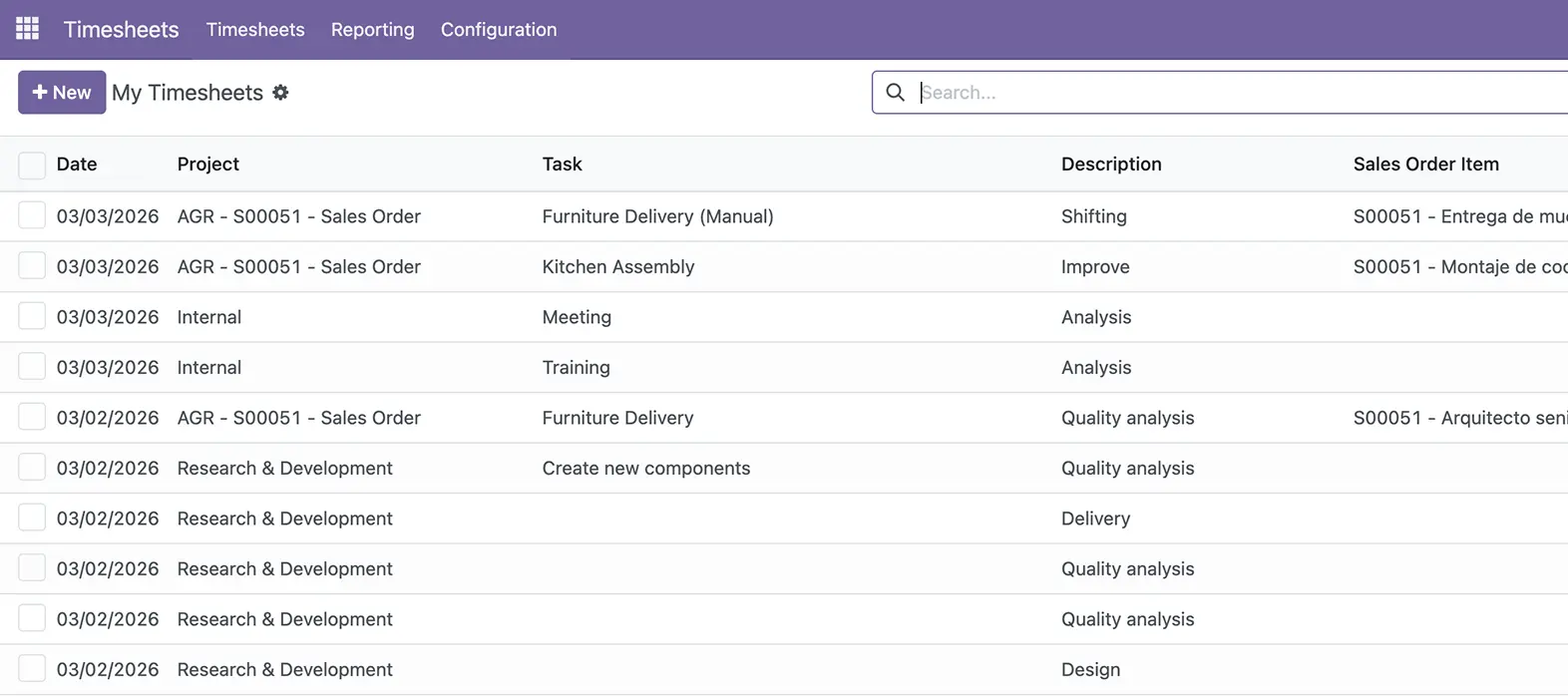 Timesheets work alongside projects, helpdesk, planning, and field service — all from the same ERP.