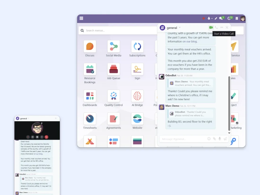 VoIP integrates with CRM, Sales, Helpdesk, Invoicing, Contacts, and more. You can make calls from any app that has the chatter — which is essentially every app in Odoo.