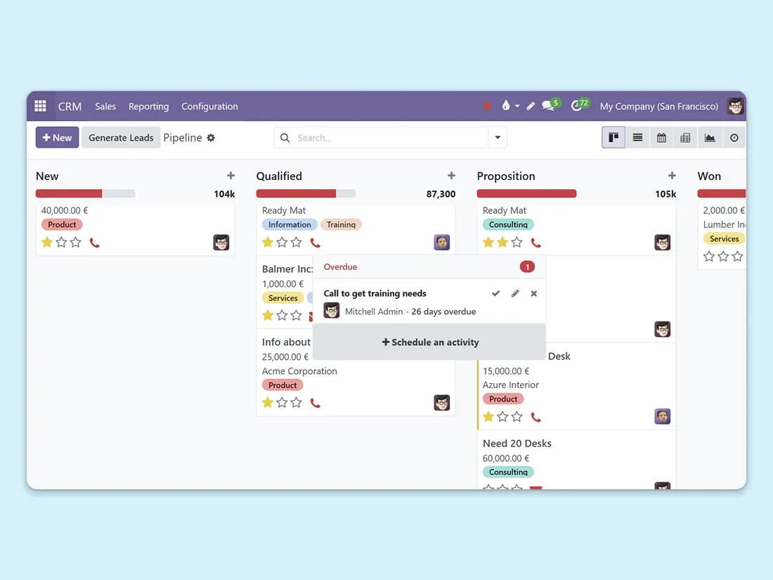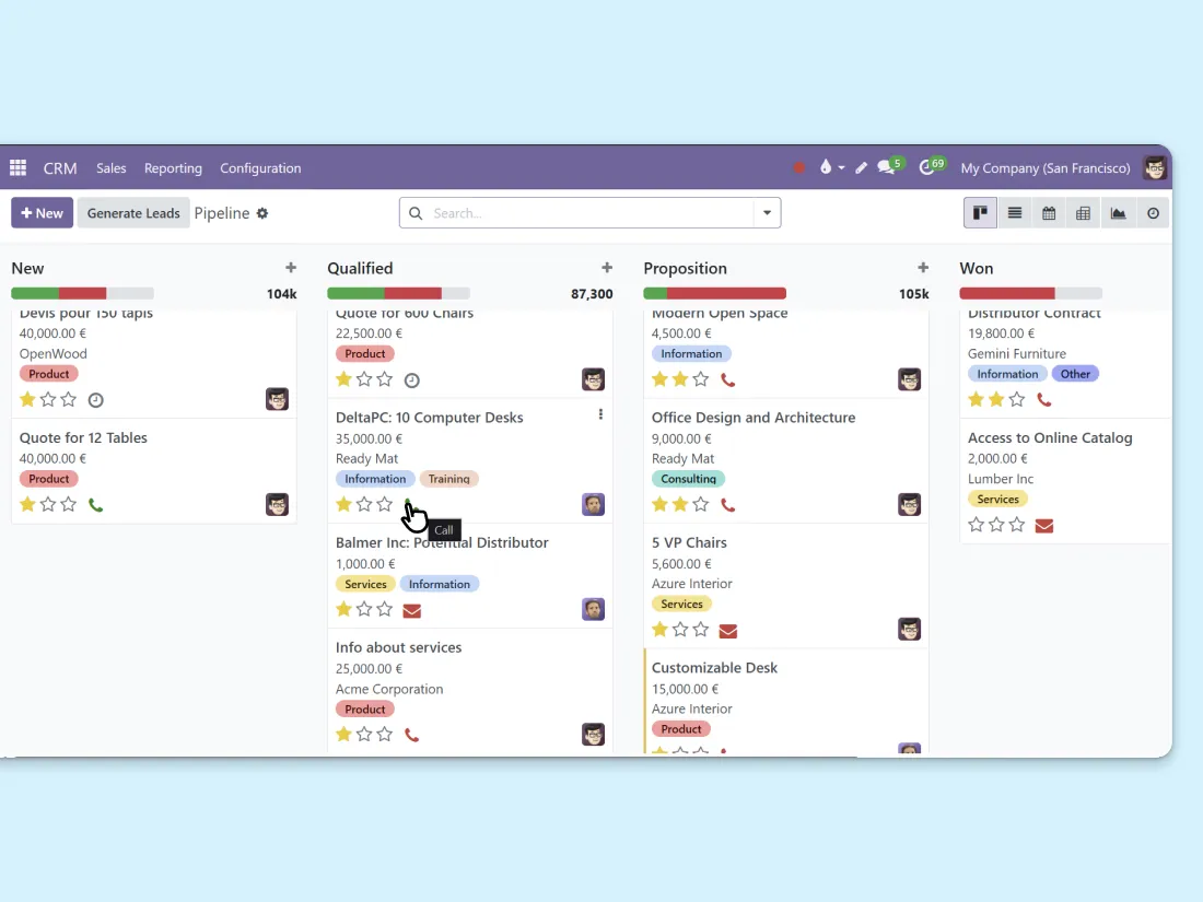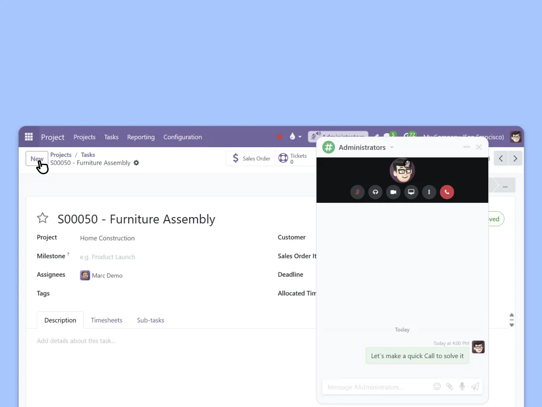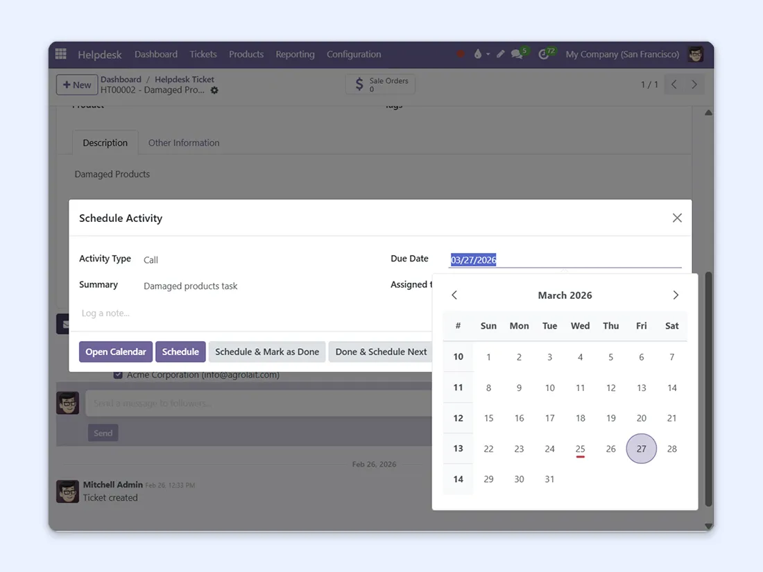 Create call activities from the chatter of any app. VoIP integrates fully into the system, so you can schedule follow-ups from CRM, Sales, or Helpdesk and never miss a callback. Your to-do list just got shorter.