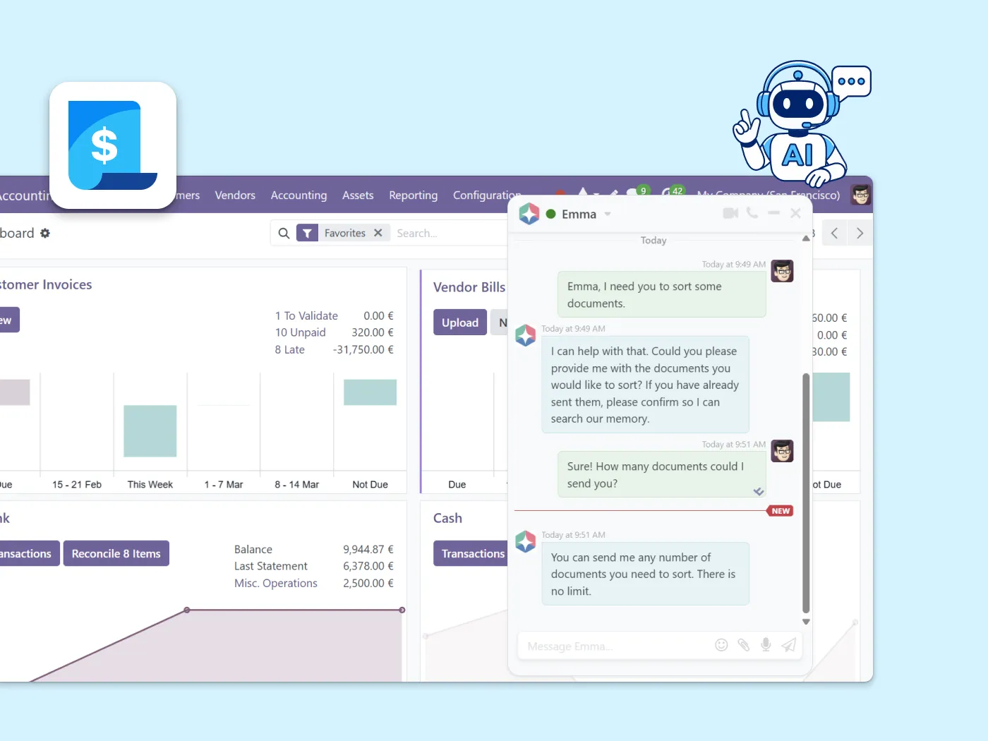 AI suggests matches between bank transactions and open entries. You approve.
